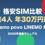 格安SIM徹底比較【2026年版】楽天モバイル vs ahamo vs povo vs LINEMO 家族4人で年30万円節約
